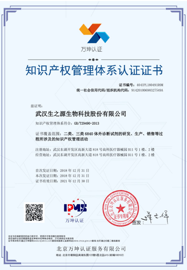 作爲國(guó)内體外診斷試劑的後(hòu)起(qǐ)之秀,武漢生之源一貫重視知識産權工作,公司專門成(chéng)立知識産權工作小組,2017年8月起(qǐ)全面(miàn)開(kāi)展《企業知識産權管理規範》相關認證工作,并在順利完成(chéng)爲期半年的試運行工作後(hòu)啓動認證申請流程。今年11月,北京萬坤認證服務有限公司組織專家團隊對(duì)生之源進(jìn)行了知識産權管理體系認證的現場審核。經(jīng)過(guò)嚴謹、全面(miàn)的審核,武漢生之源符合該标準的相關要求,順利通過(guò)認證。